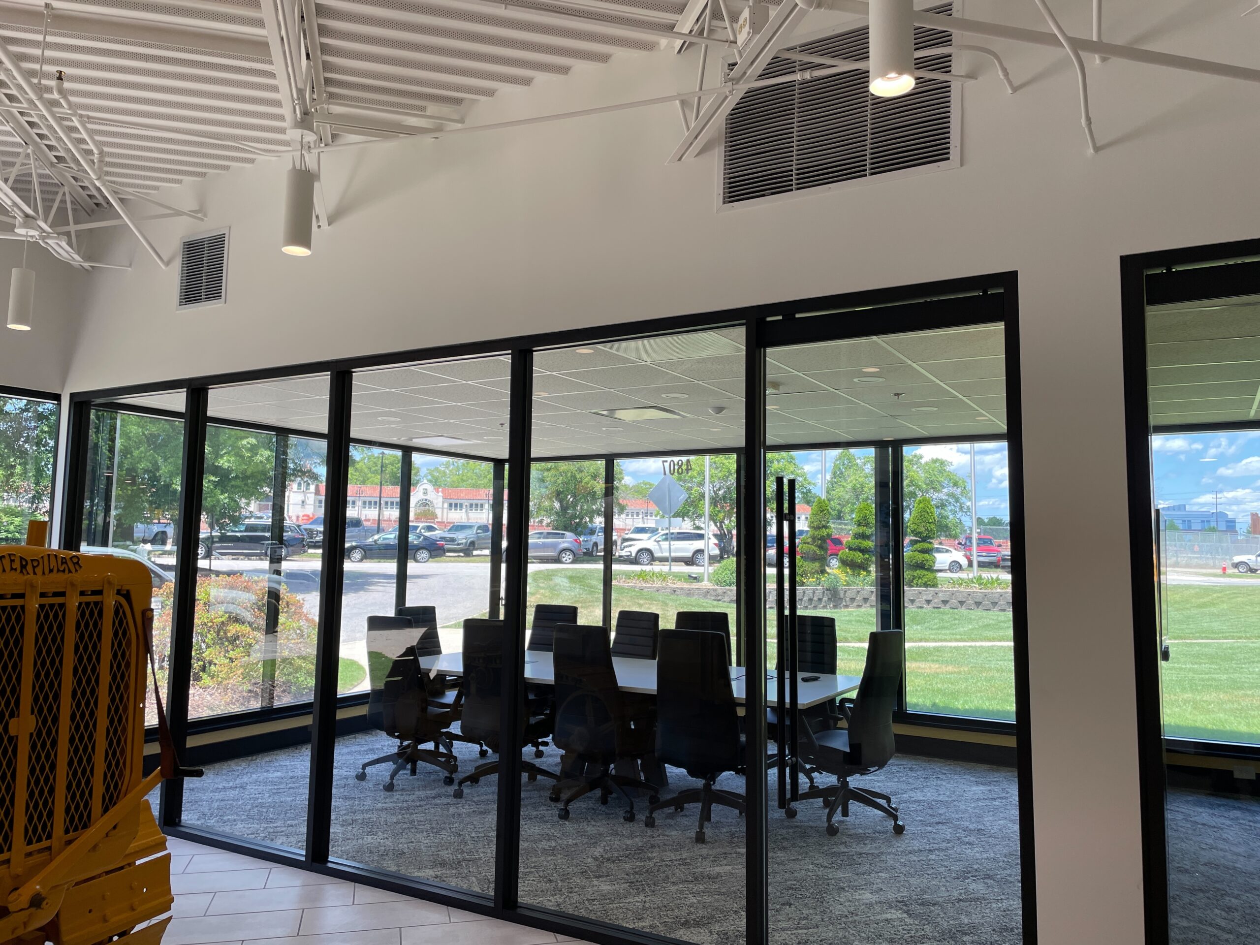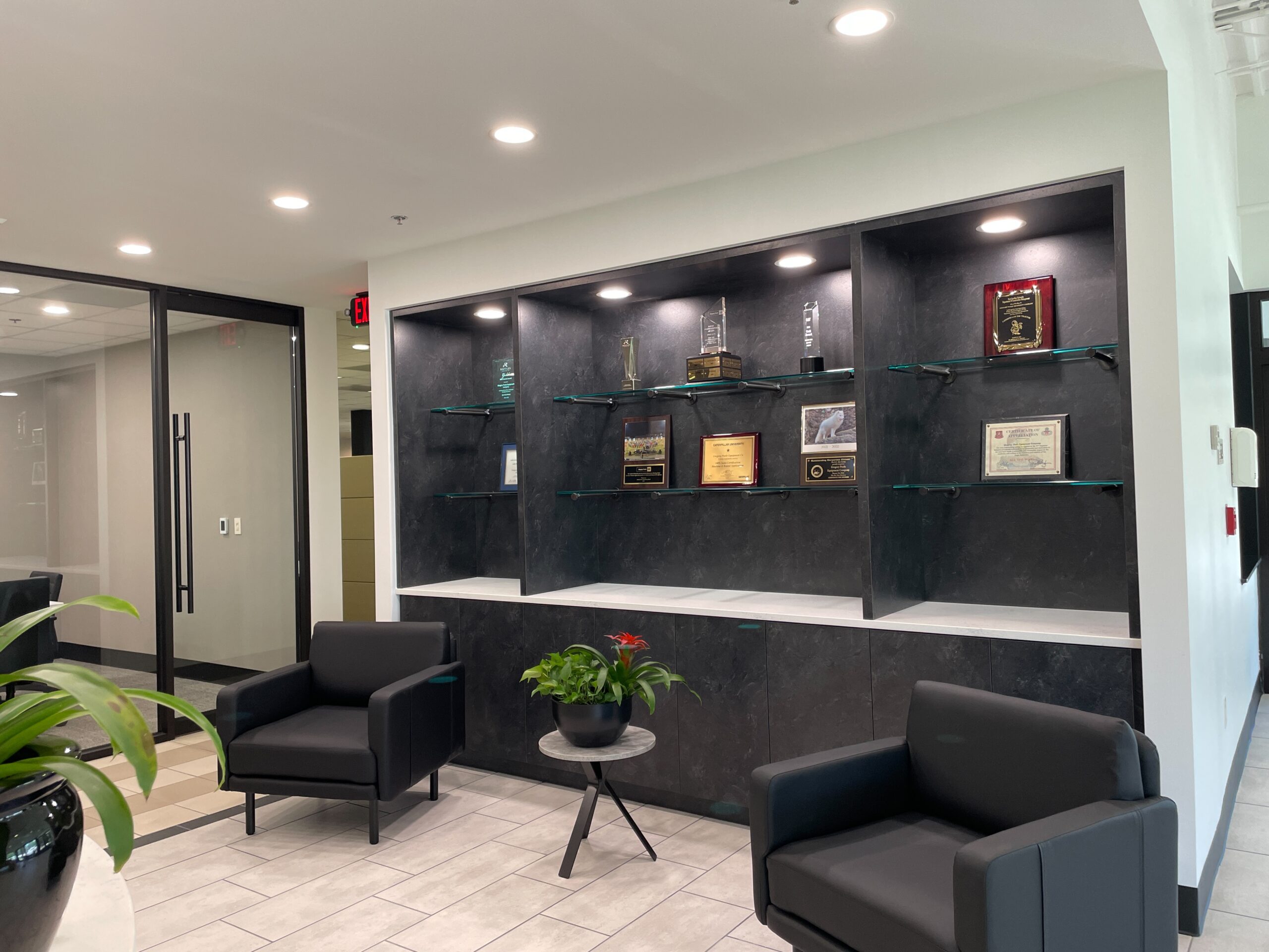 3,062 SF interior alteration of existing lobby, reception desk, and storage areas into new conference rooms, workstations, and private offices. Included demo of existing high-density storage units for build out of new offices and meeting room with new finishes, furniture and custom millwork. Lobby tile and ceiling demo with new porcelain tile throughout, exposed ceiling, light fixtures, furniture, and custom redesigned reception desk and cabinetry with artistic elements. Two new executive conference rooms with glass storefront, HVAC, and finish package. One notable challenge was the rigging & relocation of a 10,000 lb vintage tractor on display in the lobby.
